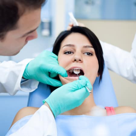 Dentists examining a girl’s teeth.